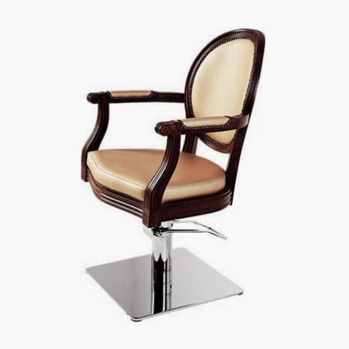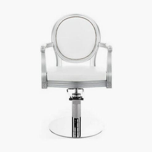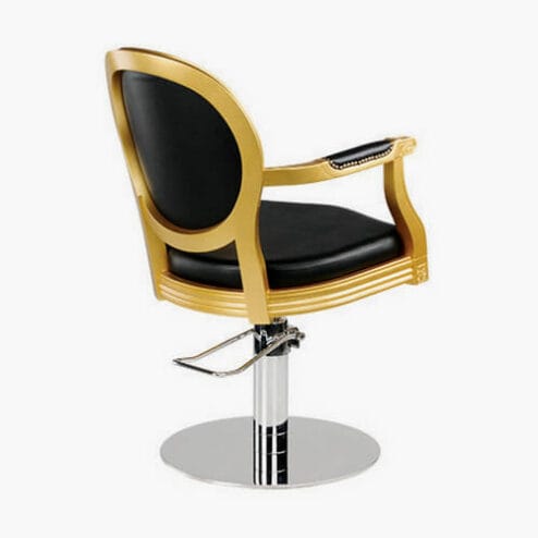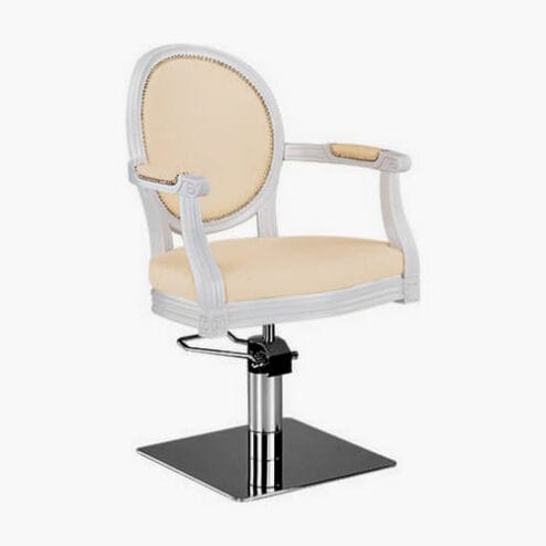 The Ayala Royal Hydraulic Styling Chair has been designed with an elegant feel, guaranteed to add a touch of class to any salon or barber shop. It is supplied with a locking hydraulic pump, on a sturdy chrome 5 star base as standard, round and square bases are available for a small additional cost and also gold round, round with tulip hydraulic and black square. The reproduction styled padded seat, backrest and armrest inserts can be made in any upholstery from the Ayala P range of upholstery and the wooded frame can be finished in a white, black, silver or gold, other wood colours are available please email info@directsalonsupplies.co.uk for more details.