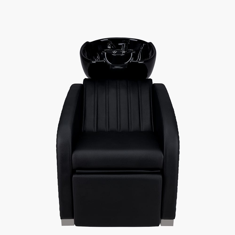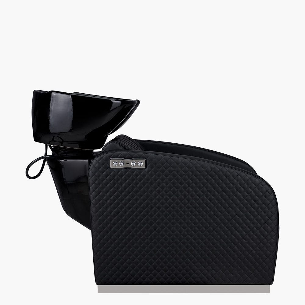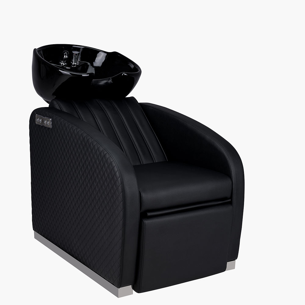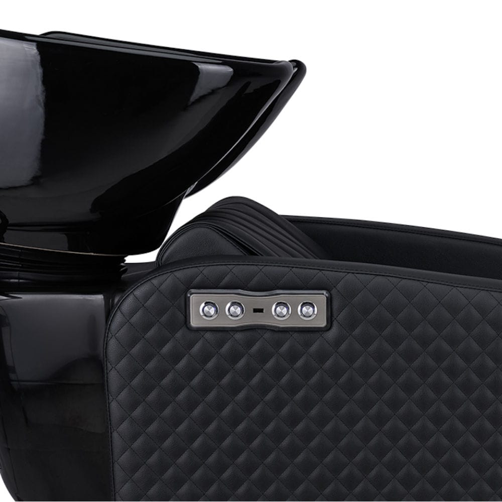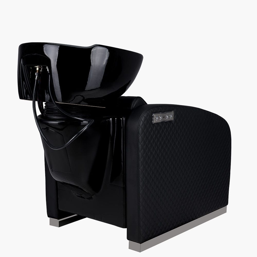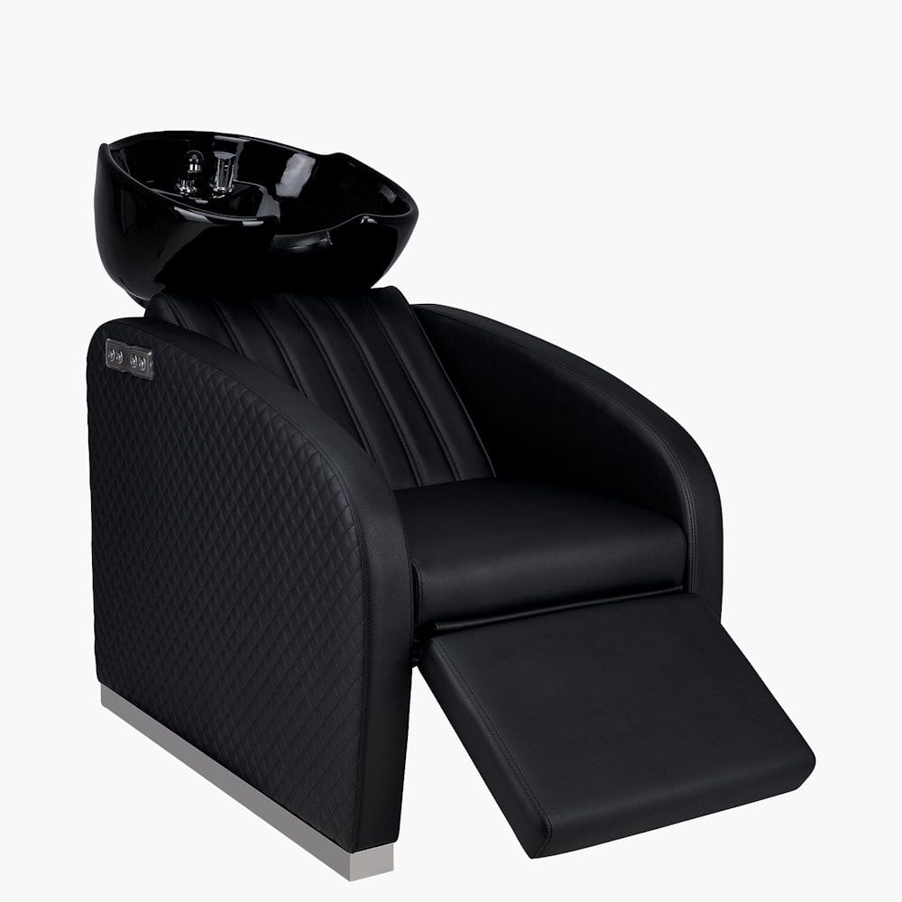Salon washpoint complete from Ayala in black upholstery with black or white ceramic tilting basin, shiatsu massage & electric footrest.
