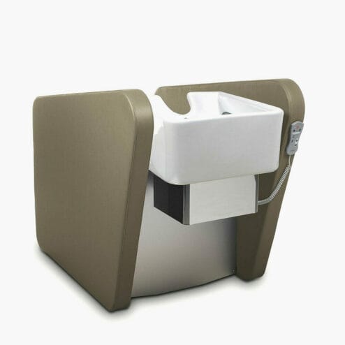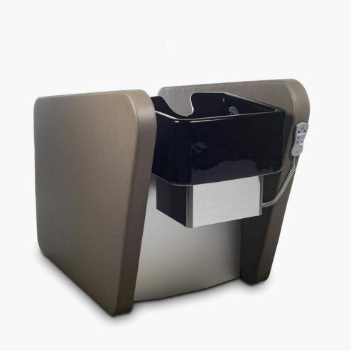 The Prive Washpoint is a luxuriously comfortable washpoint for your customers privacy with outstanding quality and finish, a one position wash unit with highly ergonomic tilting and slide adjustable white or black ceramic bowl (mixing tap and hand shower included), waste trap and integrated seat with remote control adjustment of the backrest, seat and leg rest for a fully reclining position. Available with optional Shiatsu air massage system per space. Lateral plumbing access available on request.