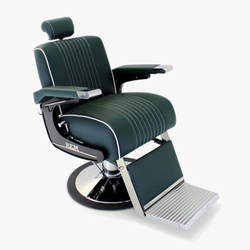 Large, comfy and reclining, in coloured upholstery, a fantastic barbers chair from REM Barbers furniture range.