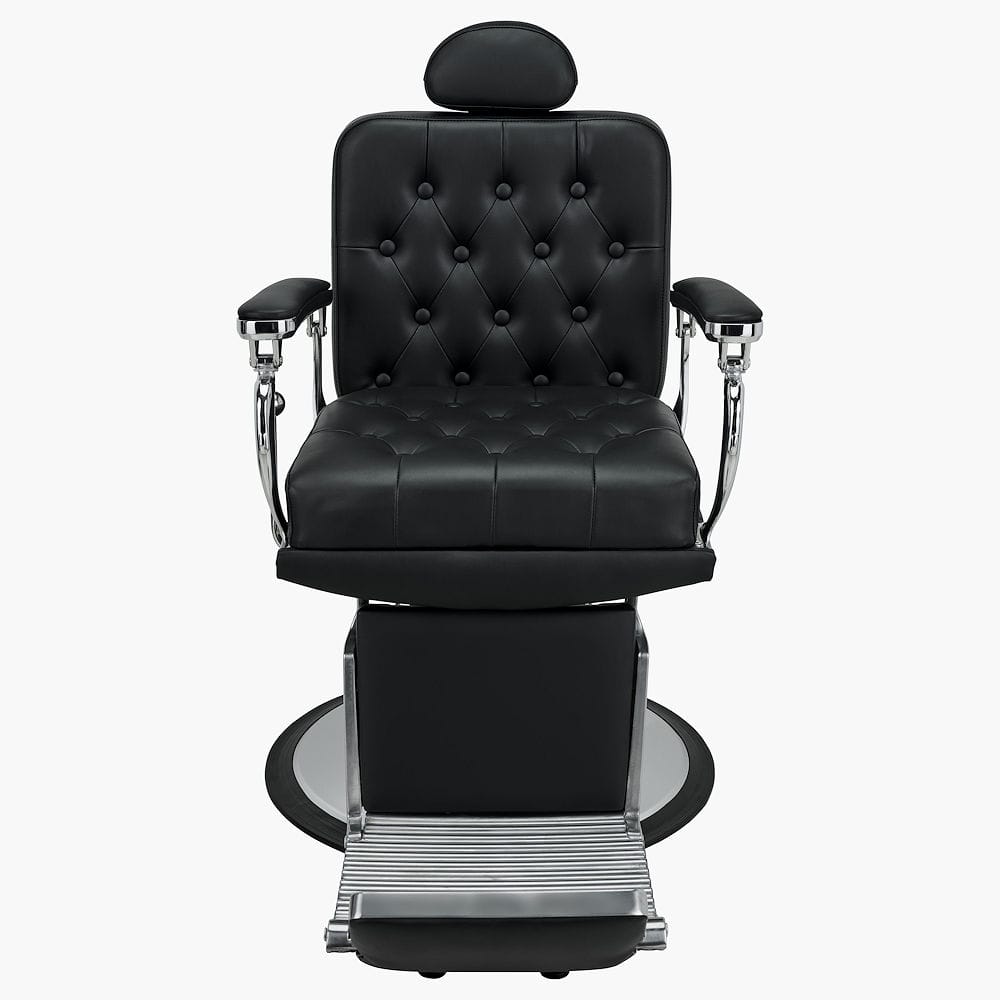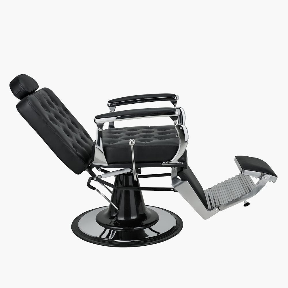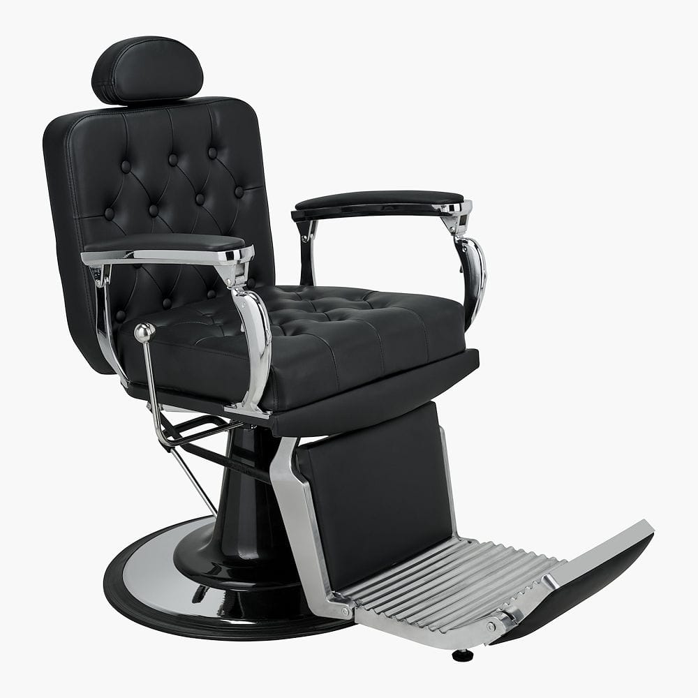 A large and comfy barbers chair which is supplied on a large locking hydraulic round base with reclining backrest with adjustable headrest and finished with buttoned seat detailing.