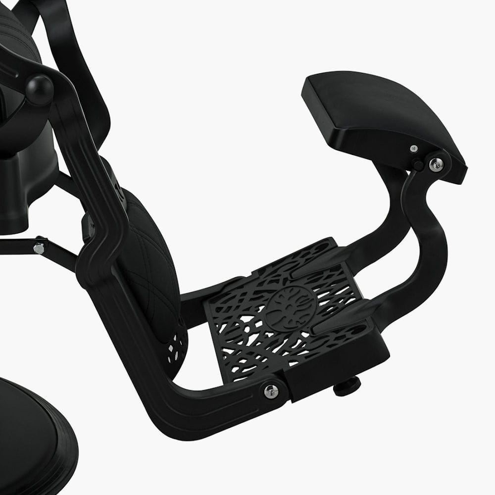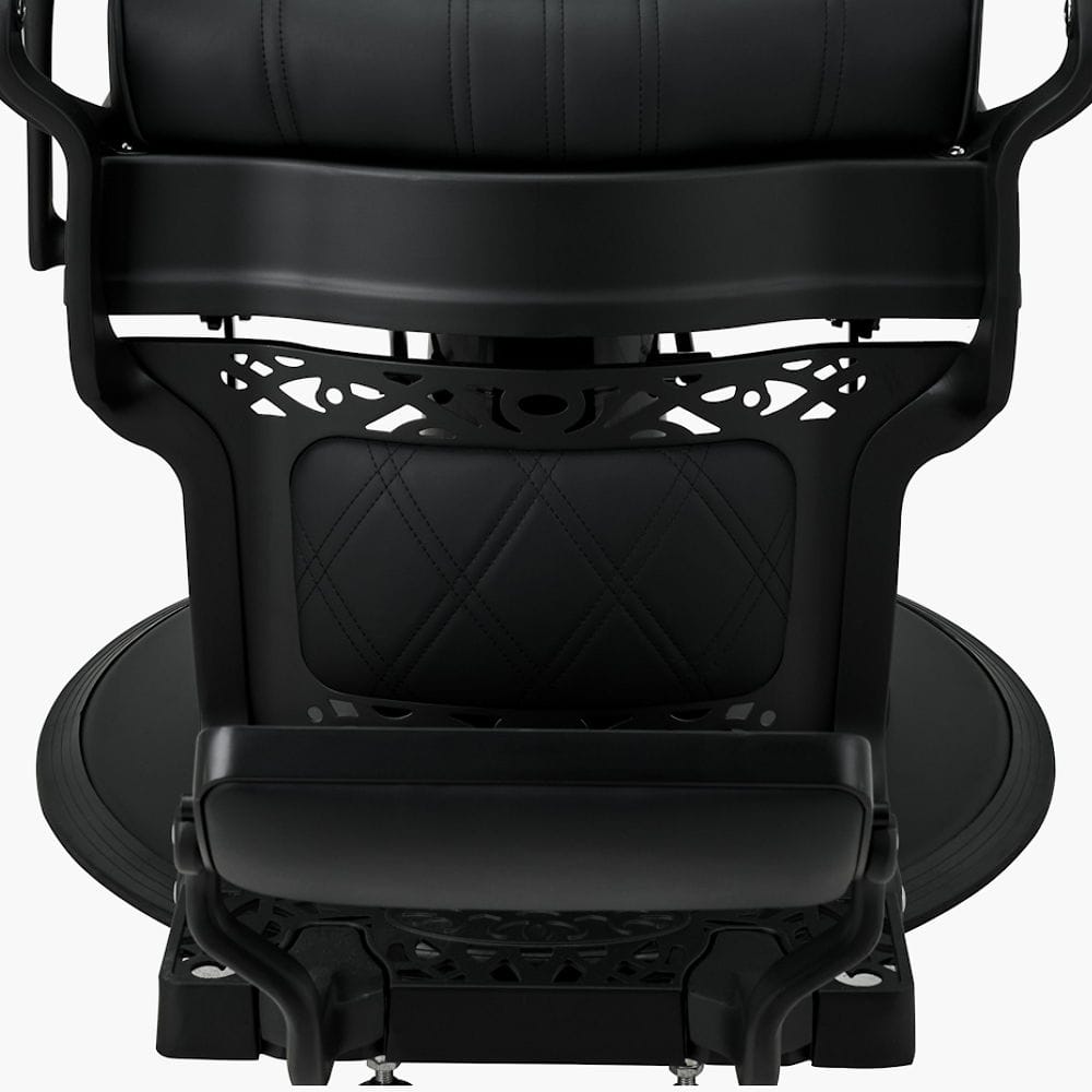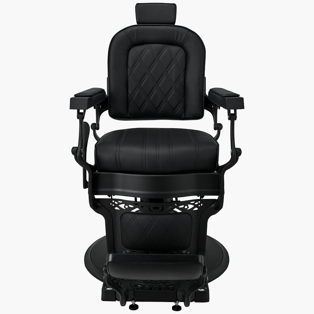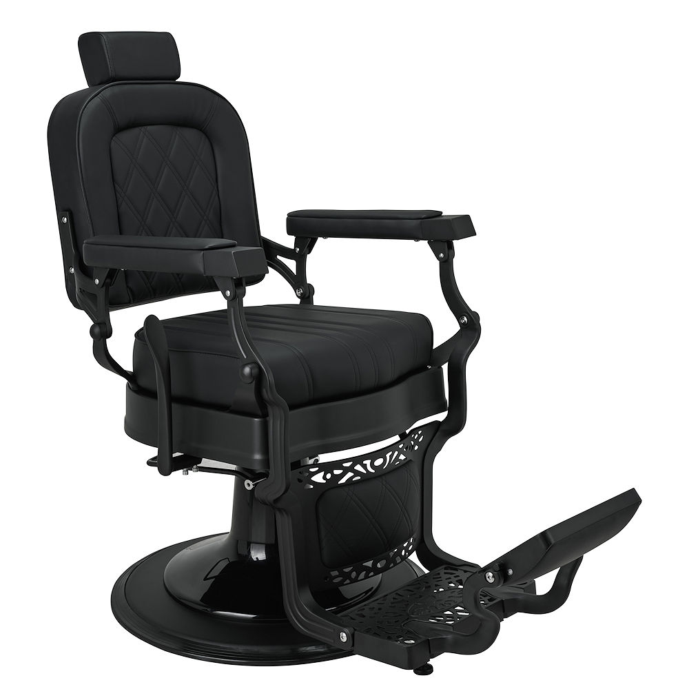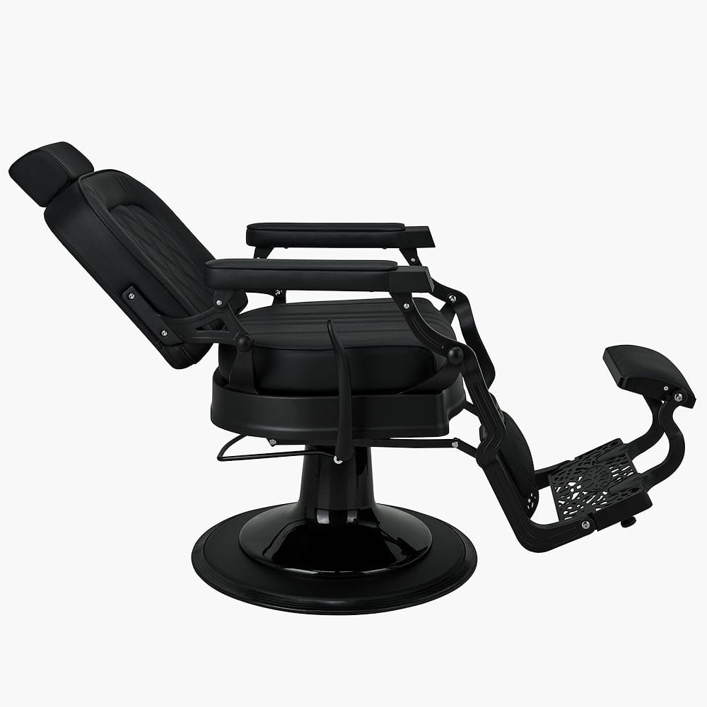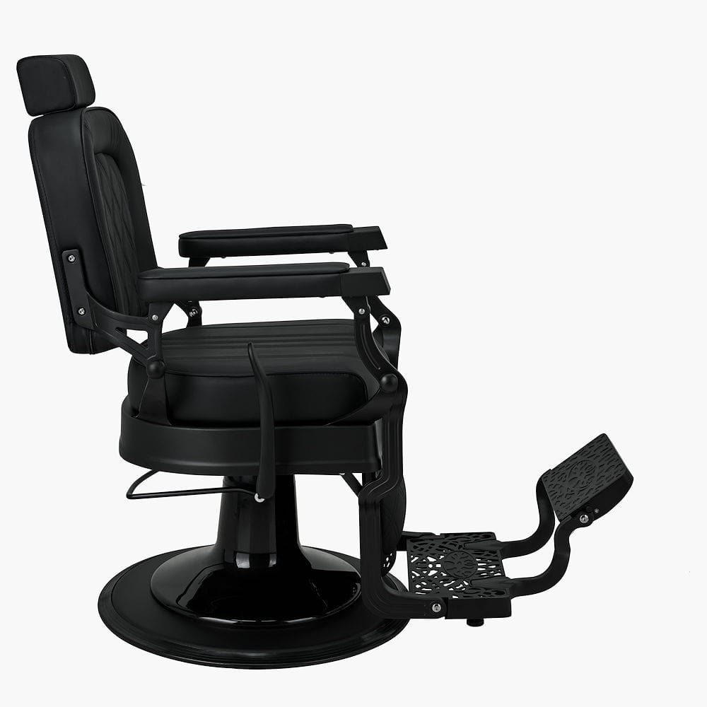 Ayala Louis Black Barbers Chair. Finished in black upholstery and black detail fitted on a large locking hydraulic base. Finished in black upholstery with Vertical stitching and matching black seat casing.