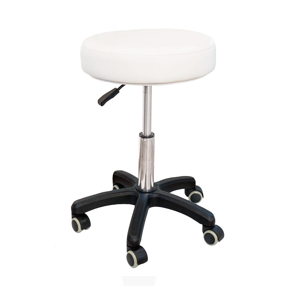 Sibel Original White Beauty Stool. Stylish beauty stool finished in white with deep round seat and available with or without a back rest, nylon 5 star base with multi directional wheels.