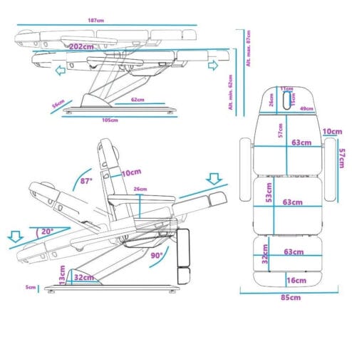 Ideal for use in beauty salons, clinics and aesthetic practices. This couch ensures that the therapist has complete ease of access to adjust the couch to suit various procedures. This versatile couch is equipped with 4 electric motors. This gives the operator full control over height, backrest, leg-rest, and seat inclination.