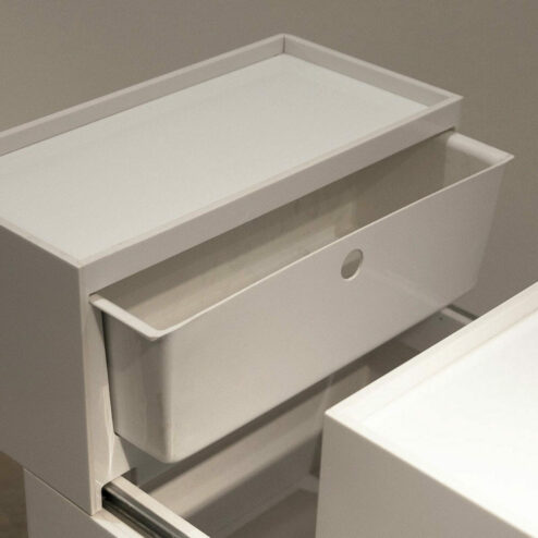 Nelson Mobilier Nelby C Beauty Trolley, stylish cube style beauty trolley on castors with unique centrally opening drawers and two levels of storage for all your equipment and bottles. Constructed in methacrylate and only available in white. Fitted with easy removable castors for easy cleaning.
