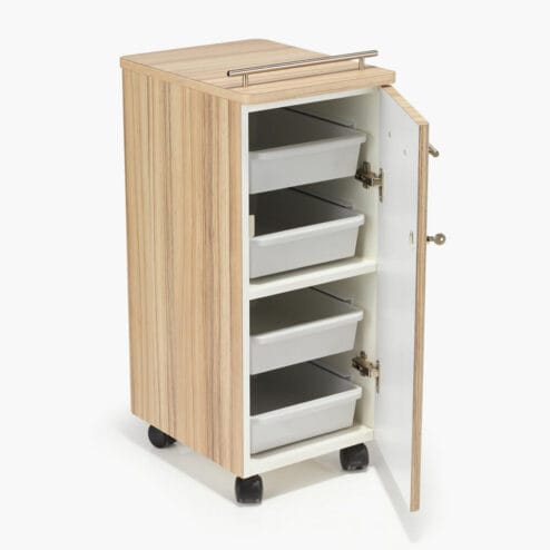 A simple, effective salon trolley from REM. The REM Prima Trolley has 4 slide out trays and fixed shelf. The security door is lockable to keep your salon essentials safe. The Trolley can be finished in any laminate from The REM Range, please choose your laminate by selecting from the swatches.