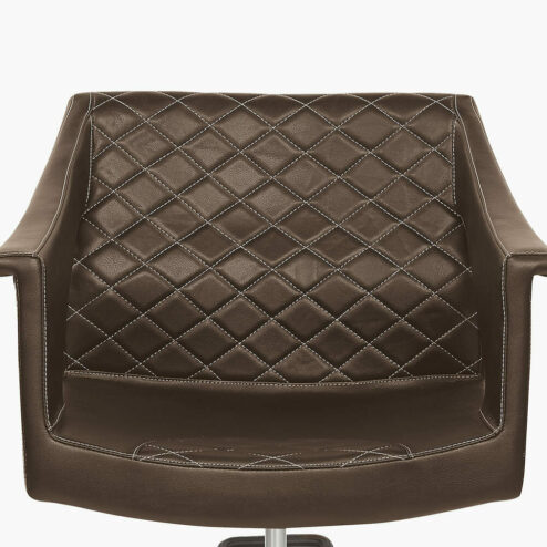 The Concorde Brown hydraulic Styling Chair is a practical yet stylish cutting chair with a textured seat with white stitching and hard wearing brown upholstery. Rear side cut outs for helping with hair removal. Comes supplied with hydraulic pump base which locks to prevent rotation and features a chrome 5 star base.