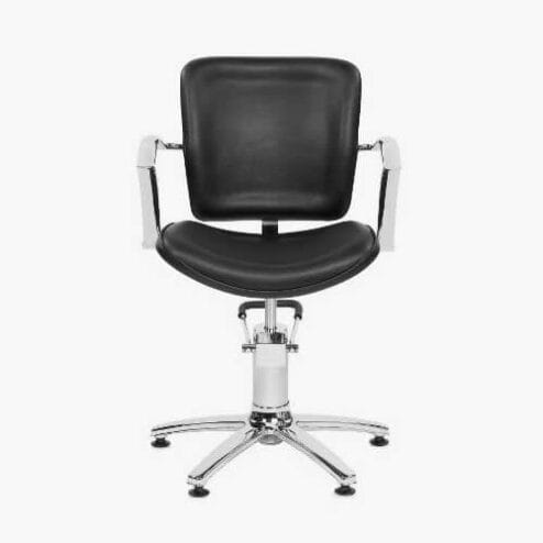 The George V Black Hydraulic Styling Chair. A practical yet stylish cutting chair with a curved seat for added comfort made with hard wearing black upholstery. Comes supplied with hydraulic pump which locks to prevent rotation and features a chrome 5 star base.