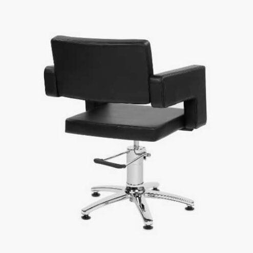 The Odeon Black hydraulic Styling Chair is a stylish square type cutting chair with a comfy seat made from hard wearing black upholstery. Large rear cut out for helping with hair removal. Comes supplied with hydraulic pump base which locks to prevent rotation and features a chrome 5 star base.