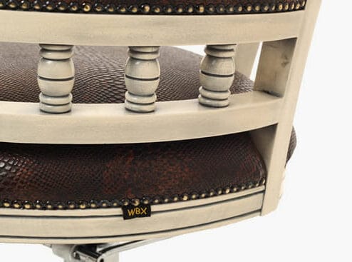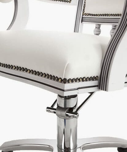 Elegant and practical design with unparalleled attention to detail and build quality. The WBX Pompadour Hydraulic Styling Chair is both stylish and durable. Hand built in the UK, it conveys traditional quality through design and flair. Available on a chrome 5 star, round, flat round or flat square base. This chair is manufactured in black upholstery with a silver wooden finish as standard. A huge range of colour combinations are available to be built to order. The solid Beech Frame lends itself perfectly to a vast range of colour finishes. Ranging from Antique Gold, Silver, Black and Distressed Cream.