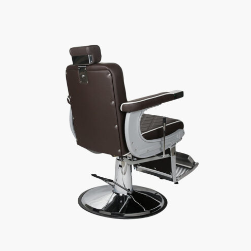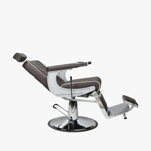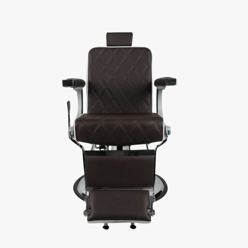Salon Fit Chrysler Barbers Chair. Classic and very nostalgic designed barbers chair with diamond design backrest and large seat with white piping, the Chrysler features a 360 degree lockable rotation, large chrome trumpet locking hydraulic base, reclining backrest with rising leg support. Upholstered padded arms and adjustable and removable headrest, upholstered padded heel rest and footrest.