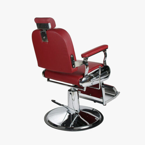 Salon Fit Empire Red Barbers Chair, classically and very nostalgic design with buttoned backrest and large comfy seat with lots of chrome detailing, the Empire features a 360 degree lockable rotation, large chrome trumpet locking hydraulic base, reclining backrest with rising leg support, upholstered padded arms and adjustable and removable headrest, upholstered padded heel rest and footrest.