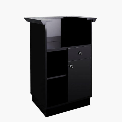 The Ayala Stone 1 is a reception desk with a practical design and an elegant look. Made in black gloss laminate and full natural stone front with LED illumination lighting making it ideal for any up-market hair salon or beauty spa, to the rear of the Stone 1 reception desk it has top working area and customer cheque shelf, open storage area, one cupboards and a drawer.