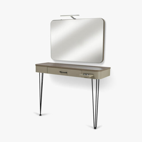 REM Simone Styling Unit, special styling unit and mirror consisting of large wall mirror with light and lower styling unit with work surface with and soft close equipment drawer and stylish decorative legs. The unit top also can come with an integral pop out dryer holder and can be finished in all one colour laminate from the REM laminate range, or in two colours like our image please use the drop down box to choose your laminate colour and dryer holder.