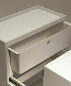 Nelson Mobilier Nelby C Beauty Trolley, stylish cube style beauty trolley on castors with unique centrally opening drawers and two levels of storage for all your equipment and bottles. Constructed in methacrylate and only available in white. Fitted with easy removable castors for easy cleaning.
