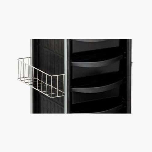 A stylish black trolley with silver trim. The Pluto Trolley features 6 drawers, a dryer holder, and a side basket to place your tools. It also has two hinged accessory trays on the top side of the trolley to place your salon essentials. The trolley is on a castor base making it easy to maneuver around your salon.