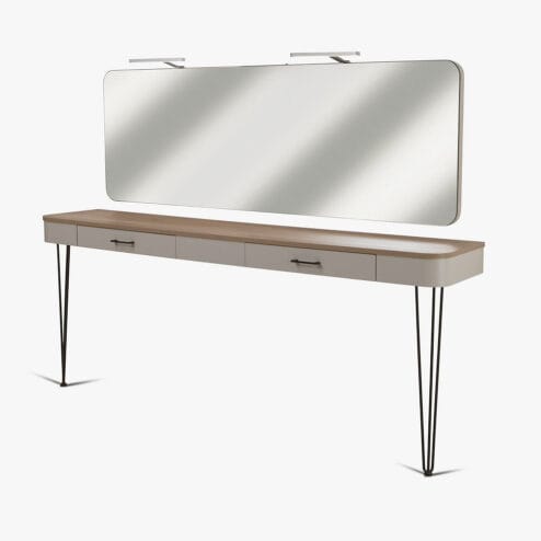 REM Simone 2 Position Styling Unit, special styling unit and very large mirror consisting of wall mirror with above lighting and large lower styling unit with work surface with two soft close equipment drawers and stylish decorative legs. The unit can come with two optional integral pop out dryer holders and can be finished in all one colour laminate from the REM laminate range, or in two colours like our image please use the drop down box to choose your laminate colour and pop out dryer holders.
